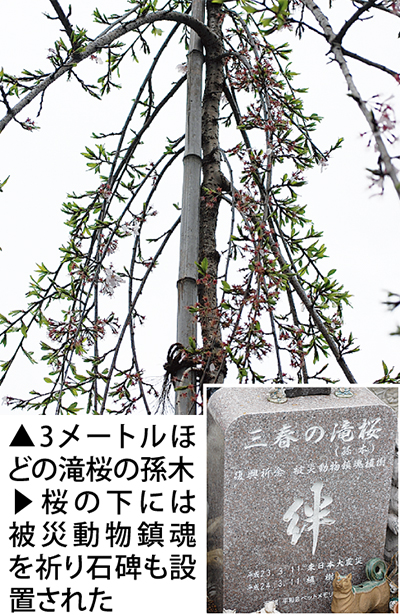 なお、同桜の下には、被災地で事故死した犬の骨が埋められ、被災動物鎮魂を祈って石碑も設置された。馬場院長は「桜を持ち帰る際に道路で発見した。せっかく震災から生き延びたのに事故死というのは救護活動の中で一番辛い出来事だった。地元の滝桜の下でやすらかにねむってほしい」と思いを語った。