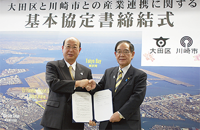 川崎市と大田区はこのほど、産業連携に関する基本協定を大田区役所で締結した。国が指定した国際戦略総合特区を抱える自治体同士の協定は全国初。