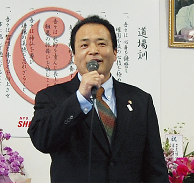 当日、道場には約200人の来賓が参加。式典が始まると、入来師範があいさつ。約30年前に元住吉に道場を開いたことや、道場移転のエピソードなどを話すと、これまで支援してもらった人たちに感謝の言葉を述べた。その後は、来賓のあいさつや鏡開きが行われ、記念の一日を大いに盛り上げた。