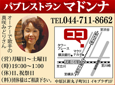 演歌歌手・真咲みどりさんの店で知られる武蔵小杉のパブレストラン「マドンナ」で開催されている、2人の人気アーティストによるライブが好評だ。