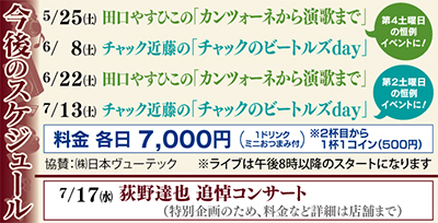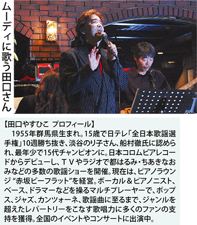 明日5月25日(土)に登場する田口やすひこさんのライブ「カンツォーネから演歌まで」では、今回はスペシャルバースデーライブを予定。これまで披露していない限定企画も用意しているとのこと。まだ”マドンナのライブ”を未経験な人は、この機会に土曜の夜をゆっくり楽しんでみては。