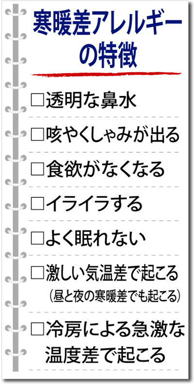 寒暖差アレルギーは、寒暖の差で鼻の奥の毛細血管が詰まり、粘膜が腫れることで起きる。鈴木院長は「花粉症みたいに『鼻の調子が悪い』という時は可能性があります。アレルギーや風邪と違い、目に症状がなく、鼻水が透明なことが特徴。昼と夜に寒暖差がある場合や、冷房による急な温度変化にも注意が必要」と話す。
