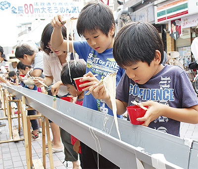 法政通り商店街で7月20日、『全長80m大そうめん流し』が行われた。