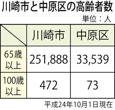 また、中原区内を見ると、65歳以上が3万3539人(同14・1%)、100歳以上の長寿が73人。最高齢は105歳の女性。