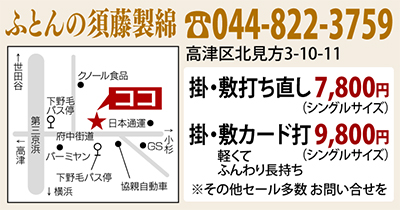 老舗製綿工場の「ふとんの須藤製綿」では、10月31日(木)まで秋のふとん打ち直しセールを実施中。製綿から仕立てまで一貫して行い、熟練職人による手作りの打ち直しはまるで新品同様に生き返る。側(がわ)見立てを持参し自宅まで車で伺うので、利用しやすい点も好評。