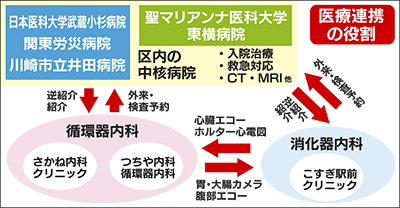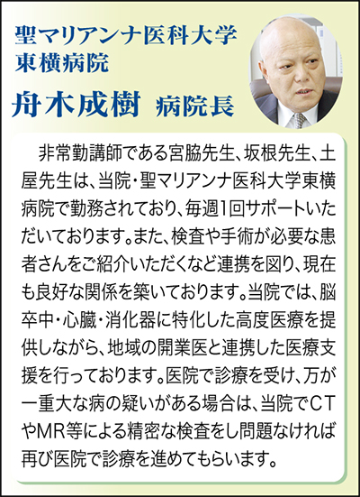 聖マリアンナ医科大学東横病院で地域医療に携わってきた同士で、現在それぞれの専門性を生かした「医療連携」を結んでいる「つちや内科・循環器内科(土屋勝彦院長)」、「こすぎ駅前クリニック(宮脇誠院長)」、「さかね内科クリニック(坂根健志院長)」に「医療連携の重要性」について聞いた。