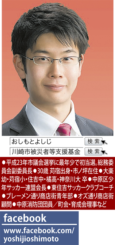 また、今月閉会した第三回定例会では、震災復興のため国の要請による給与削減を盛り込んだ川崎市職員の給与の特例に関する条例案について、共産党以外の賛成多数で可決。本年10月1日から来年3月31日までの間、市長ら特別職と一般職員を対象に、給与を削減するもので減額率は、市長、副市長がいずれもマイナス13%。その他の特別職は同10%、一般職員は役職によって同9・77%〜3・77%、課長級以上に支給される管理職手当は同10%としており、削減額の合計は、約16・1億に上ると試算されています。また、議員の報酬についても同じく7%削減(合計約2千万)を盛り込んだ議員提出条例案が上程され、賛成多数で可決されました。
