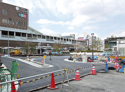 供用開始は3月30日からで、駅前広場の広さは約4500平方メートル。3カ所のバスの乗降場、UD対応のタクシー乗降場、身障者スペースなどが設けられます。地下は駐輪場で約2200台の駐輪が可能です。