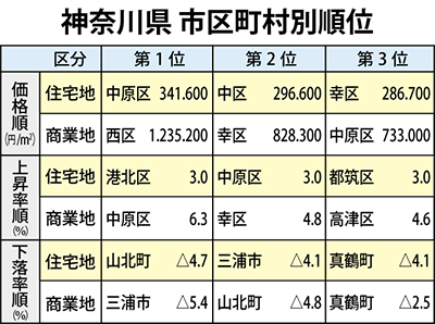 県内の住宅地は上昇・横ばい地点の占める割合が昨年の58・4%から76・1%と増加。川崎市では都心に近い優位性が反映され、全ての区で平均変動率が上昇し、市全体として1・4%の上昇となった。中原区は住宅地価が34万1600円(1平方メートル当たり)となり、県内トップ。個別の地点では再開発と人口増加が進む武蔵小杉駅周辺の1地点が8・5%と前年に引き続き上昇率県内1位となった。同課は「人口が増え、商業施設が出来ることで利便性が高まり、さらに人口が増えるというプラスのサイクルになっているのでは」と話す。