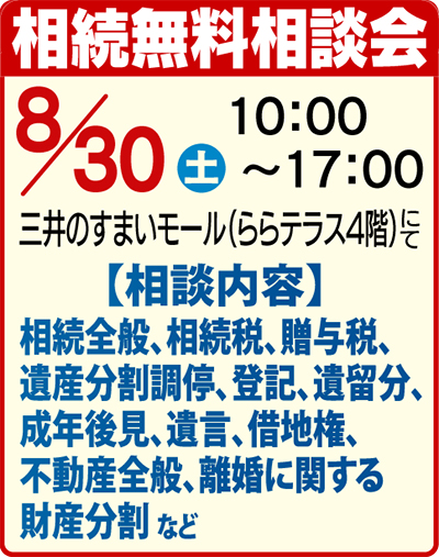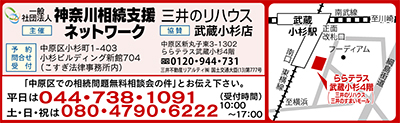 一般社団法人・神奈川相続支援ネットワークと三井のリハウス・武蔵小杉店では、相続や不動産に関する個別相談会を8月30日(土)に行う。参加無料。予約制のため、申込みは電話で。