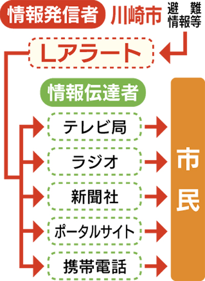 川崎市は9月1日から、災害時にテレビやラジオ、ポータルサイト等を通じて市民にリアルタイムで避難勧告などの災害情報を発信するシステム「Lアラート(情報共有コモンズ)」の運用を開始する。神奈川県に先駆けての運用で県内自治体では初めて。