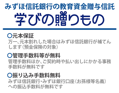 みずほ信託銀行では本制度に基づく「教育資金贈与信託」を取り扱っている。「将来使う教育資金を自分が元気な時にお孫様に譲れることが大きな特徴です。お気軽にご相談下さい」。なお本商品は、信託代理店であるみずほ銀行でも相談できる。