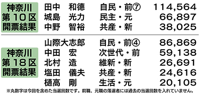 14日に投開票された衆議院議員総選挙で、3人が立候補した神奈川県第10区(川崎区・幸区・中原区の一部)では、自民党の田中和徳氏が7度目の当選を果たした。また、同18区(宮前区・高津区・中原区の一部)では自民党の山際大志郎氏が他の4候補を抑え4回目の議席を手にした。