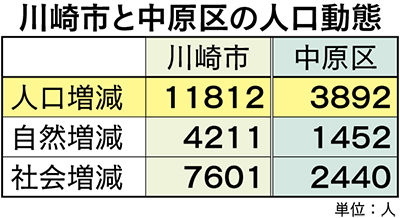 中原区の人口増加数は3892人。川崎市の増加数の約33%を占めており、2年連続で市内トップに。「中原区は武蔵小杉駅周辺の大規模な住宅供給、利便性の良さが若い世代に受け入れられた」と同課は分析する。市内の他区と比較しても自然増減、社会増減ともに中原区が多い結果となった。