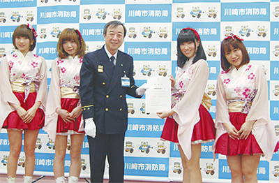 川崎市消防局では2日、放火火災防止の広報大使に、ご当地アイドル「川崎純情小町☆」を任命し、委嘱式を行った=写真。