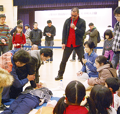 市民館をメイン会場に行われた防災フェスは多くの人達で賑わった。参加者らは災害時のトイレや降雨体験車、非常時の食事、防災井戸汲み上げなどの体験を通じて防災意識を高めていた。また、プロレスラーの蝶野正洋さんもゲストで登場し心臓マッサージの指導を行った=写真。NPO法人小杉駅周辺エリアマネジメントの安藤均理事長は、「階段駆け上がりレースと防災フェスのコラボという初めてのイベントで不安もあったが、多くの人が集まってくれて良かったと思う。3月11日の後のイベントということで、防災意識を高める良いきっかけになったのでは」と述べた。