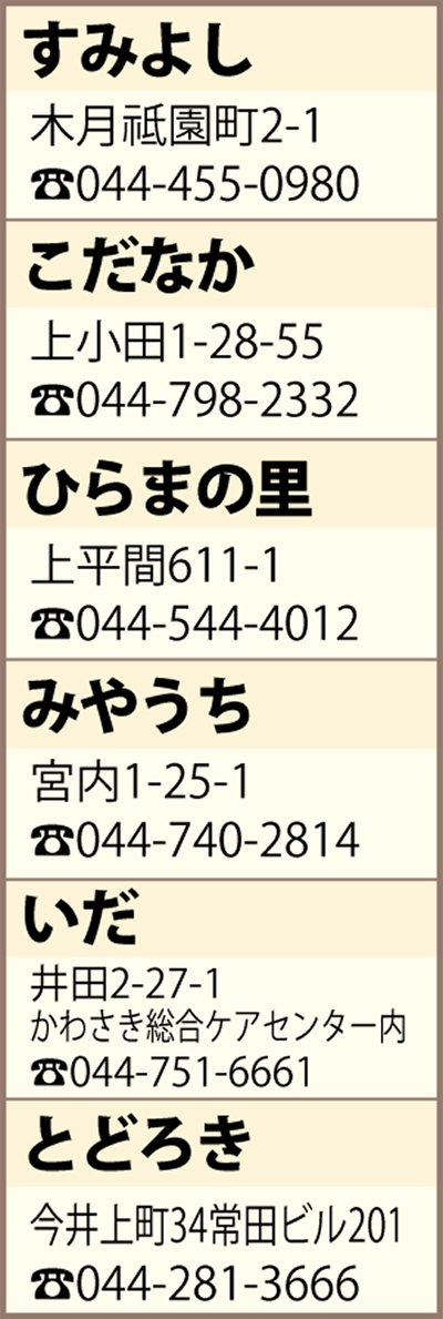 同センターでは、要支援1・2と認定された人のケアプラン作成の手伝いや、支援や介護が必要となる可能性が高いと判断された人のケアプラン作成などを行う。中原区内には6カ所=表=が設置されている。