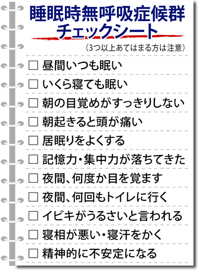 睡眠中に息が止まる状態が何度も起こる睡眠時無呼吸症候群(SAS)。日常生活にも大きな影響を与える疾患だ。「この病気は本人に自覚がなく、家族や友達から指摘されることがほとんど。高血圧や心筋梗塞、脳卒中、脳梗塞を起こす危険性は3〜4倍になり、メタボリックシンドロームや糖尿病との関連もあります。睡眠中の酸欠状態が血液をドロドロにし、細い血管が詰まりやすくなります。昼間の眠気がさまざまな支障をきたすことも多いです」と鈴木院長。