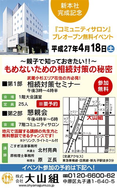 第2部は地域の人のための「懇親会」で7階のコミュニティサロンを無料開放。武蔵小杉に拠点をおく弁護士や税理士と相続対策や資産活用等の懇談ができる。同社では「土地や建物など、お客様の資産に携わる当社として相続に関する疑問にお応えし、安心して暮らせるようイベントを企画しました。皆様お誘い合わせの上ご参加下さい」と話す。