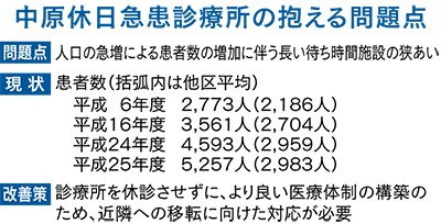 平成22年4月に本市が公表した将来人口推計によると本市の人口は今後も増加傾向にあり、平成42年がピークとなり、150・8万人になると見込んでいましたが、平成22年10月に国勢調査が行われたことや大規模な住居の開発などによりこれまでの推計値への影響が懸念されることなどから新たに将来人口推計を行ったところ、ピークになる平成42年の本市の人口は152・2万人になるとの見込が出されました。特に中原区では平成47年まで人口増が続き、27・2万人となり市内7つの区の中で最も多い人口数が続くことになります。また本市の4月1日現在の人口は146万6444人で、京都市の人口を上回り政令市20市中7位となりました。さらに本市の人口増加率は11・87%で20市中1位となっています。人口増により、個人市民税の増加や土地の評価替えにより固定資産税が増加するなど前年度に比べて40億円の増加が見られています。しかしその反面、社会保障関連の経費の増加や公共施設の長寿命化の取組みなどの戝政需要や、市長の公約でもあった最優先課題の待機児童の解消に向けての取組み、小児医療費助成制度の拡充、中学校完全給食の取組みなど歳出面についても極めて厳しい状況にあります。しかしこのような戝政状況下にあっても、子育て支援や災害に強いまちづくり、市内各産業や商店街の活性化など時機を逸することなく将来に向け必要な施策を実施することが求められます。その必要な施策の一つでもあり、見出しにも書かせて頂いた中原休日急患診療所の現状と今後の方向性についてご報告いたします。同診療所については下記別表の通り、患者数は年々増加し、平均患者数も他の6つの区と比較してもその数は多くなっています。これは人口の増加による患者数の増加に対し施設の機能が対応しきれなくなっていることに起因しており、早急な対応が必要となっています。より良い医療体制を構築するため、平成26年度に診療所を休診することなく近隣へ移転させることが決定されました。その候補用地として市民の利便性、立地、面積の観点から既存施設の近隣にある中原区役所暫定駐車場跡地(旧中原消防署)が敵地であり、本年度から建設が着工し、平成29年度の開設が予定されています。整備手法としては医師会に中原区役所暫定駐車場跡地を譲渡し、医師会は中原休日急患診療所(新医師会館を含む)を整備することとなっています。医師会を中心とした明確な責任体制と診療スタッフの良質な医療サービスが提供される事になります。今後も医療体制の充実に向け、しっかりと努めてまいります。