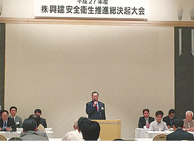 総合建築業者の(株)興建(中原区今井仲町)では、安全衛生教育の徹底を図るとともに、作業現場などでの労働災害事故防止を目的に21日、ホテルKSPで「安全衛生推進総決起大会」を行った=写真。