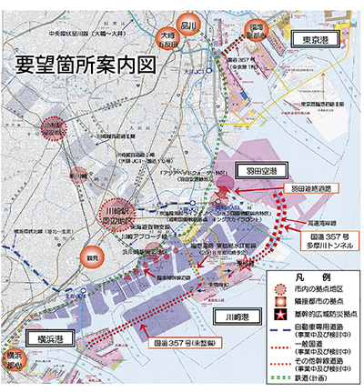 要望内容は、【1】川崎縦貫道路II期計画について東京外かく環状道路東名以南との一本化を含めた幅広い検討の推進による早期の計画具体化、【2】川崎縦貫道路の街路計画を基本にした国道409号の先行整備および川崎駅周辺の交通円滑化のための国道15号〜国道1号間のバイパス化等の整備の早期実施、【3】2020年を目指した成長戦略拠点の形成を支えるインフラとしての羽田連絡道路の早期整備と一般国道357号の未整備区間の着実な整備の3点。