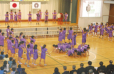 2年生は「元気」をテーマに、絵本「スイミー」を劇と歌で披露。傘をくらげに見立てるなど、海の中の様子を制作物で表現しながら、元気いっぱい表現。来賓席からは微笑みがこぼれた。3年生は日々見守ってくれる地域の人、先生や学校関係者へ「いつもありがとう」と述べ、秦基博の「ひまわりの約束」を合唱。多くの人の「やさしさ」に感謝した。5年生のテーマは「友情」。一世風靡セピアの「前略、道の上より」をダンスで披露。全力で熱い友情をダンスで表現すると、会場は熱気に包まれた=写真。