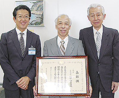 上丸子山王町の(有)松下納豆店(松下藤吉代表取締役)が食品衛生事業功労者として厚生労働大臣賞を受賞したことを受けて11月5日、鈴木賢二区長に表敬訪問を行った。