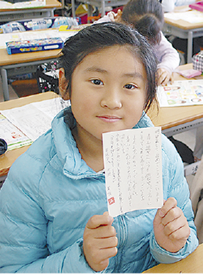 宛名の書き方を川崎営業統括本部の立山一穂(いっすい)さんが黒板に張られた大きな年賀状図で説明し終えると、児童たちは一文字一文字丁寧に書き、裏面は、自分の近況を伝える文章に個性が表れた。また、同社から子どもたちへ「消しゴムハンコ」がプレゼントされ、仕上げにそのハンコを文末に押して提出した。授業を受けた小西慶人君は「3歳のいとこへ書いている」と、真剣な表情。「私は、おばあちゃん」「ぼくは友だち」と、書き終えた児童たちから楽しそうな声があがった。