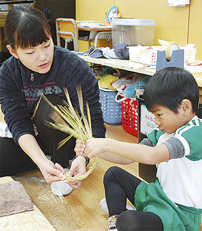 園庭にある田んぼで稲刈りを行った後、乾燥させていた藁を使用し、教諭の助けを得ながら編む姿は真剣そのもの。仕上がると、ホッとしたのか「飾るのが楽しみ」と、笑顔を見せた。「全ての活動を関連づけ、日常の活動へつなげることを心掛けている。また、伝統行事を子どもたちへ伝えて行ければ」と、教諭らは話す。
