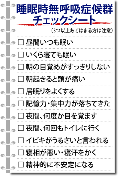 女性にも悩む人が多いこの症状は、なかなか自分で気づくことができず、他人から指摘されることがほとんど。左記のチェックシートに3つ以上あてはまる場合はSASの疑いがあるという。「この病気は高血圧や心筋梗塞、脳卒中、脳梗塞を起こす危険性は3〜4倍になり、メタボリックシンドロームや糖尿病との関連もあります。眠気から交通事故の原因になることもあり危険です」と指摘する。
