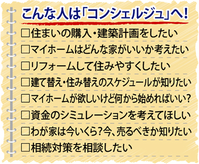 「マイホームが欲しい」「買うならいつ?」「戸建とマンションはどちらがいいか」「住宅ローンはいくらまで借りられるか」など、同店は住まいの購入、売却、建築、リフォーム、条件整理、資金計画、相続贈与、選択肢の絞り込み、といったあらゆる相談に応じ、専門の提携会社を紹介し、計画を進めてくれる。