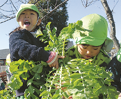 約130本を収穫し、園では味噌汁や漬物に。「お店で売られている野菜は、全て農家の方が大事に育てたもの。種まきから、食べるところまで一連を体験することで、食の大切さを実感してくれれば」と教諭。