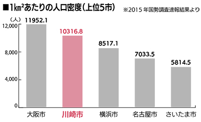 川崎市の人口密度は前回の2010年調査と同様、大阪市に次いで2位。499・5人で20市中最も低い静岡市の約21倍にあたる。1万人を超えているのは川崎市、大阪市の2市のみ。