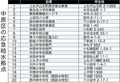 大地震などの災害で家庭の水道が出なくなった場合にそなえて、川崎市では市内139カ所(うち中原区は18カ所)に空気弁や貯水槽、貯留管を利用した応急給水拠点を設置している。