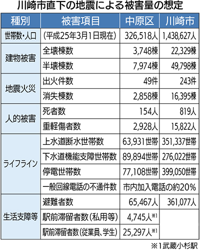 仮に、この川崎市直下の地震が冬場の午後6時に発生した場合、中原区内の被害想定は、出火が約50件(市全体で約240件)、死者が約150人(同約820人)、負傷者が約3000人(同1万6000人)に上るという。