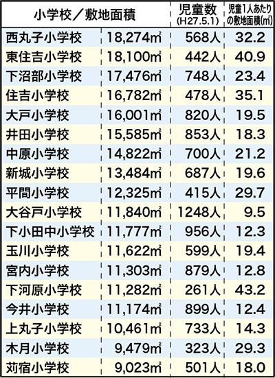 小杉を中心に人口が増えていることもあり、新学校が建設される付近の西丸子小、上丸子小、中原小、今井小の児童1人あたりの敷地面積は18・9平方メートルと区内の平均22・8平方メートルと比べ窮屈な環境となっているが、特に基準は設けていない。しかし、区内では大谷戸小の約9・5平方メートルから下河原小の約43・2平方メートルまで差があり、今後、学区分けによって児童の分散ができるかも課題となる。