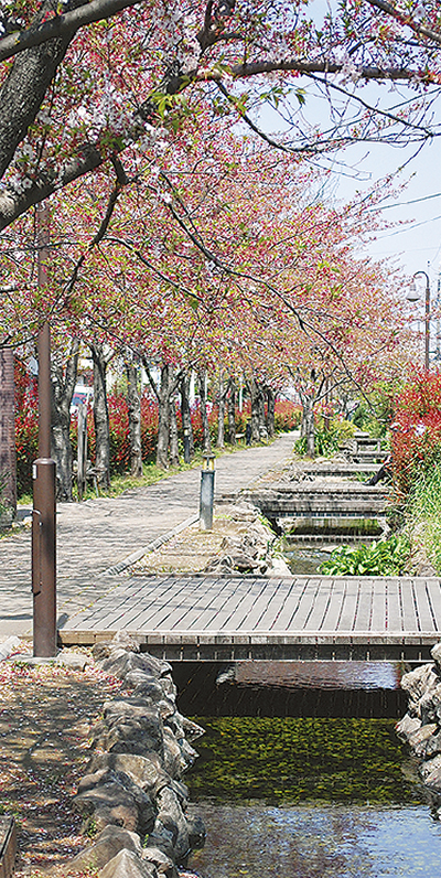 心地よい春の日の散歩なら江川せせらぎ遊歩道へ。下水道整備で河川としての役割を終えた江川の跡地を利用した区民の憩いの空間。新城から井田方面まで繋がっており、全長約2・4キロメートルの間には8つのゾーン(【1】湧水の小径、【2】桜のプロムナード、【3】散策の道、【4】ふれあい広場、【5】せせらぎ広場、【6】清流の道、【7】あぜの道、【8】河原の道)がある。それぞれテーマごとに植物や自然石等の配置にこだわっており、変化を楽しめる。