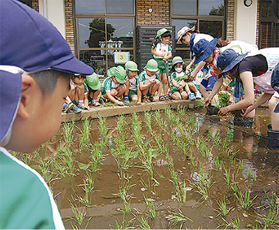 当日は年長の園児156人が参加。園児らは田んぼの周りに集まり、苗の植え方を観察した。初めて田植えをみた園児も多く、「自分でもやってみたい」との声が多く聴かれた。