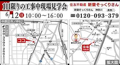 耐震補強に実績のある住友不動産新築そっくりさんの「工事中現場見学会」が6月12日(日)、中原区市ノ坪の一軒家で開催される。普段見ることのできない基礎や土台、構造材、耐震方法などを公開。気になる”我が家の耐震性”を見直す絶好の機会となっている。