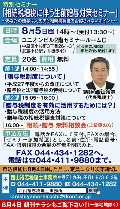 しかし、関心は高いものの、贈与税の仕組みが分からないという人も少なくないだろう。そこで、武蔵小杉密着の西山裕志税理士事務所の西山氏が、無料セミナーを開催する。「税務署から贈与と認められないケースや、相続でのトラブルなども少なくありません。例えば、贈与契約書を交わすということも重要です。安心して贈与と認められる贈与の仕方、将来の相続対策のためになるようなポイントをお伝えします。まずは事前申込下さい」と話す。定員になり次第締切。