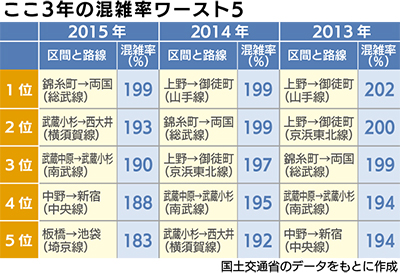 混雑率は車両の定員に対する乗車人数の割合で示される。南武線の武蔵小杉と武蔵中原区間、横須賀線武蔵小杉と西大井区間は3年前からワースト上位だったが、2015年は横須賀線武蔵小杉→西大井間が193%でワースト2位、南武線武蔵中原→武蔵小杉間が190%で3位に入った。