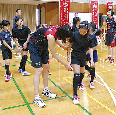 レッドロケッツは今月行われたアジアクラブ選手権大会に日本代表として出場し、優勝したばかり。教室には同選手権大会でMVPを受賞した古賀紗理那選手をはじめ、リオデジャネイロ五輪日本代表の島村春世選手ほか全選手が参加。バレーボールの基礎から試合に生かせる技のコツまで、ふれあいを楽しみながら指導にあたった。
