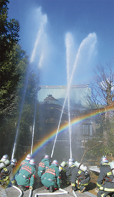 今回は、本堂から出火し、初期消火を試みるも、火災が拡大する設定で訓練。119番通報を受け、消防隊員が現場に到着すると、本尊と逃げ遅れた男性を救出し一斉放水した。