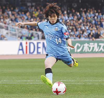 始球式に臨んだ3人は軽快なステップを披露。最後はサッカー経験のある吉川さんがシュート。惜しくもバーに弾かれたが2本目は落ち着いてシュートを決めた。