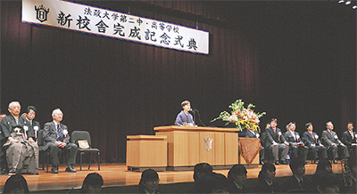 法政大学第二中・高等学校(北詰昌敬学校長)の新校舎完成を記念した式典が3月25日、同校の木月ホールで行われ、関係者ら450人が集まり校舎の完成を祝った=写真上。