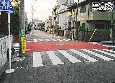 次に、木月二丁目町会内のある交差点については、信号機の撤去等の事情により、すぐさま数件の事故が発生していたことから、その間の緊急的な対策として、電柱への注意喚起幕の設置を行った他、要望を頂いた交差点の”カラー舗装化”の取り組みに向け、「通学路安全対策会議・中原部会」を通じて議論され、今年度の予算確保へ、取り組みを促して参りました。その結果、カラー舗装化工事が行われ、その対策が実現致しました。(写真2)これからも区民の要望に耳を傾け、あらゆる機会を通じて本市にその対応を求めて参ります。