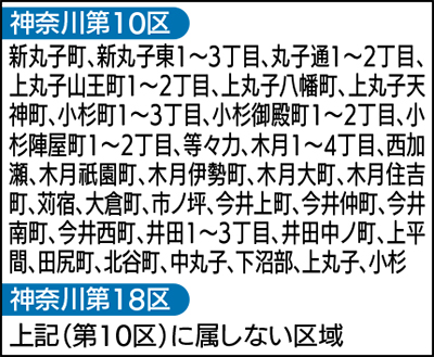 中原区の選挙区は「1票の格差」是正のため今年6月に施行された区割り改定法により、今回の選挙から井田三舞町と井田杉山町が10区から18区に移る。各地域の選挙区は表の通り。