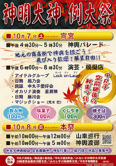 7日は、午後4時30分からの神輿パレード(飛び入り参加可能。服装自由)のほか、6時から境内で様々な演芸が披露される。今年は女性3人のアイドルグループ『Lock on Laugh(ロックオンラフ)』がライブをするほか、扇乃会、藤川会が日舞、中丸子愛好会が民謡、星屑隊がオカリナ演奏、荒木巴さんがマジックショーを行う。