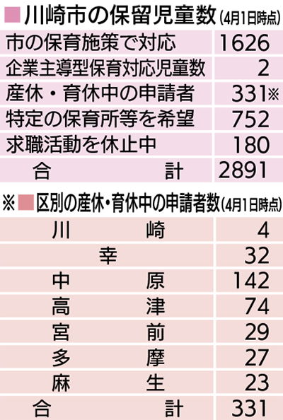 川崎市の前回集計ではこの新定義は適用されておらず、申請をしたものの、保育所を利用していない「保留児童」は2891人だった。そのうち、「産休・育休中の申請者」は331人で、このうち何人が新たに待機児童として集計されるのかがポイントとなる。